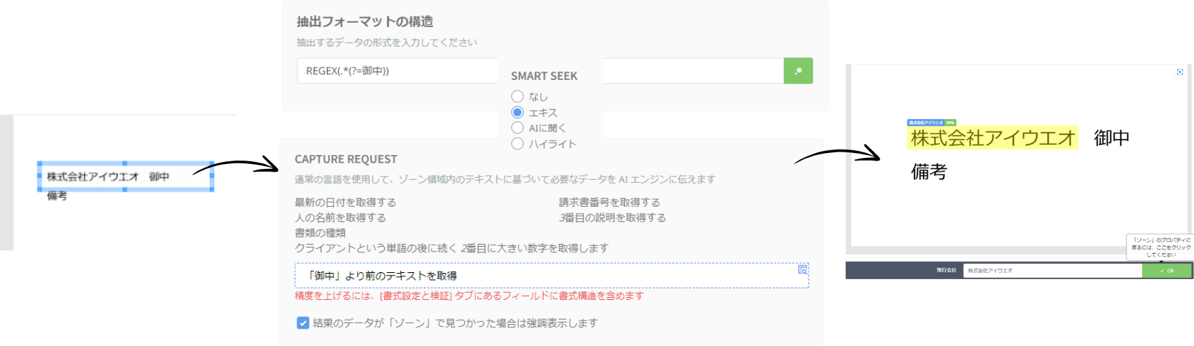 「正規表現」式または「AI 命令」を使用して、OCR 領域または AI フィールドで取得したい情報を指定します。